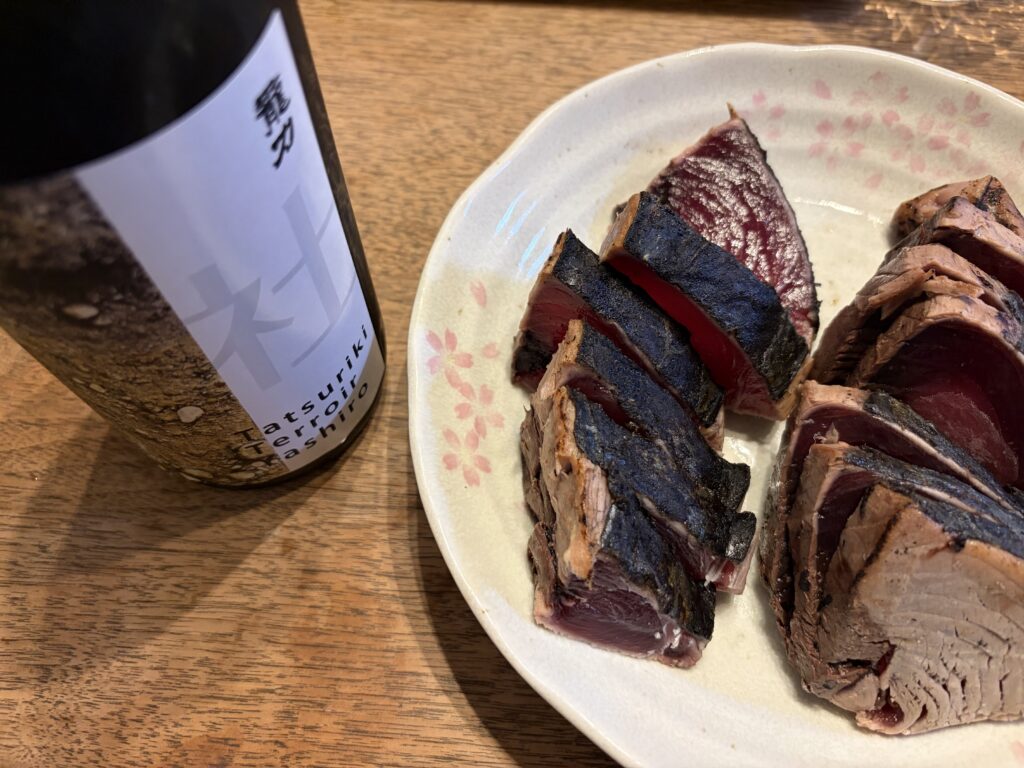 カツオの藁焼きタタキとも相性抜群です。こちらは本場・高知県のふるさと納税返礼品で、生臭さはまったくなく、藁焼きの香ばしさとカツオの旨味がしっかりと広がります。龍力と合わせると、カツオのしっかりとした味わいと程よい酸味が龍力と見事に調和し、互いの旨味を引き立て合います。